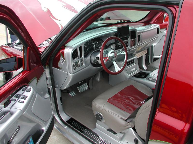 custom seats, all interior painted to match exterior of truck, design from hood flows in to dash, leather roof and floor
