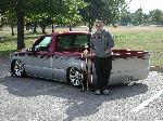 designed by Tim Armstrong of Kreative Kustoms, painted Ford frost silver along bottom with House of Kolor Candy Brandy Wine on top, custom bed formed around notches, all smoothed no handles, gas tank relocated inside bed, caddy tail lights, completely smoothed back end