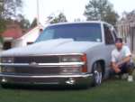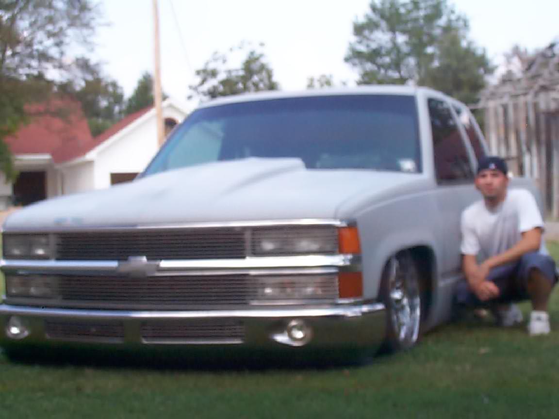 shaved: handles, tailgate, antenna, wiper squirters, cab seams, tailgate, w/ box, bed post holes, 3rd brake light, emblems, molding, and those little rubber things on the window sill. Roll pan, smooth billet front bumper w/ split billet, all euro lights, phantom grill, cowl hood, BIG IG logo on back....