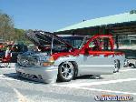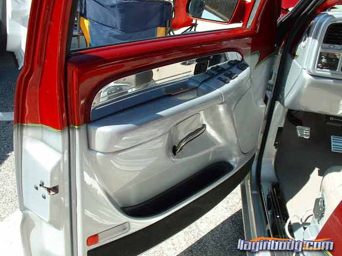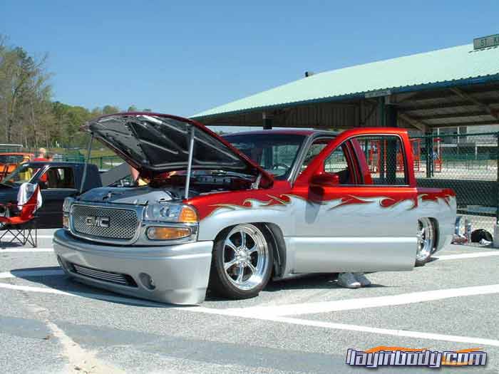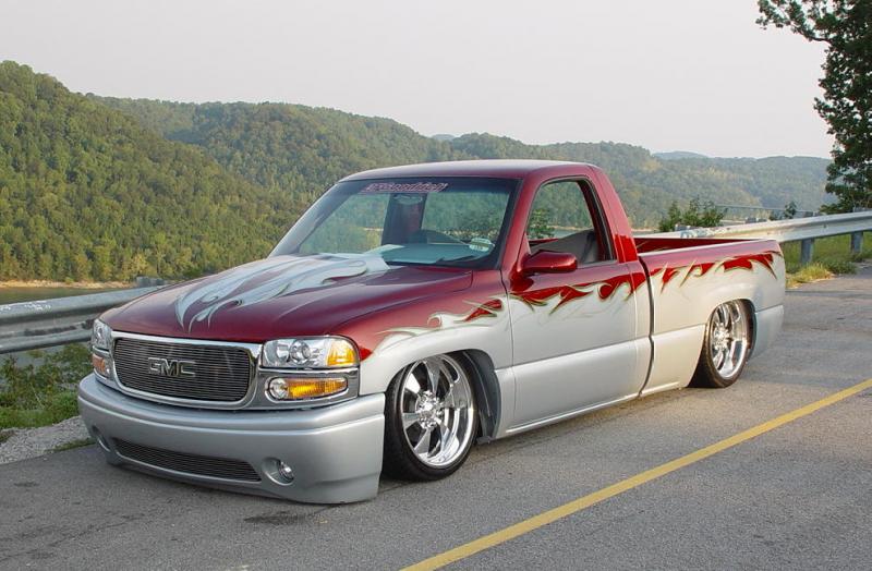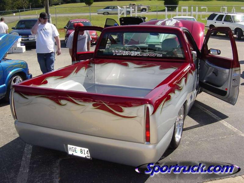 shaved: stake holes, handles, tailgate, roll pan, cab seams, full sheet metal inner bed w/ relocated gas door, 96 caddy lights, 02 denali front clip, smooth wiper cowl, painted Kandy Brandywine, Ford Frost silver, and Green apple (paint and bodywork by Tim Armstrong of Kreative Kustoms in Ashland City, TN)