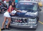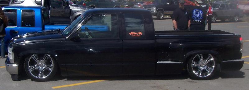 doors & tailgate handles shaved, drip rails on roof and back of cab shaved, frenched in fiberglass roll pan, FBI LED third brake ligt custom frenched into top of tailgate.....black with heavy chrome flake paint