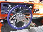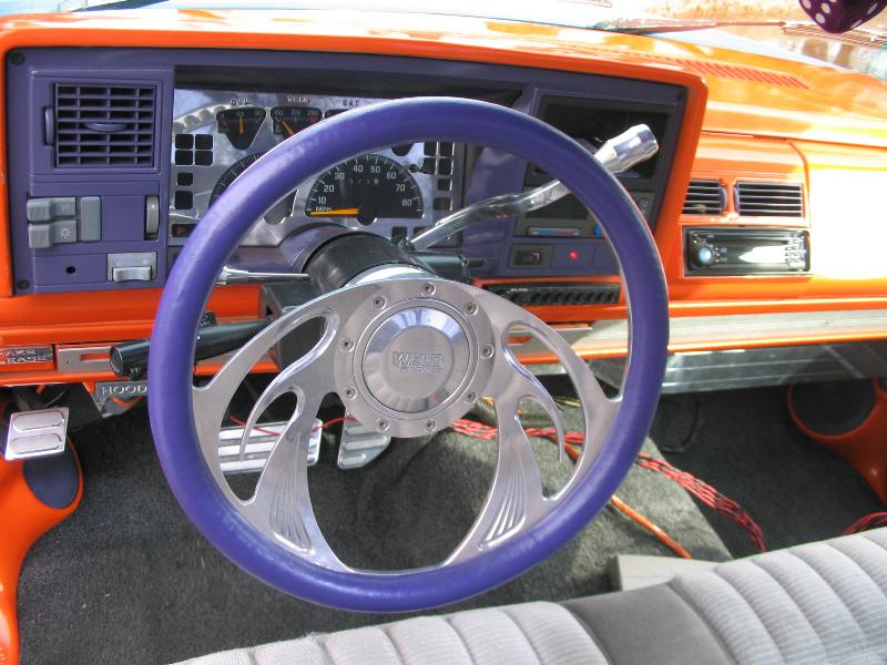 lots of billet inside, smoothed and painted dash and interior(HOK tangelo pearl), headliner and speaker box wrapped in purple vinyl; 95 mustang buckets wrapped in orange and purple vinyl w/ stitched flames
