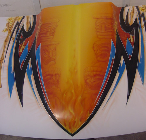 shaved hadles,3rd brake, tail lights, caddy lights, shaved front bed, back of the cad and fire wall, paint and body by Todd Boatrite, graphics by Chrales "The KID" Armstrong