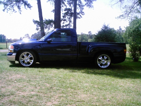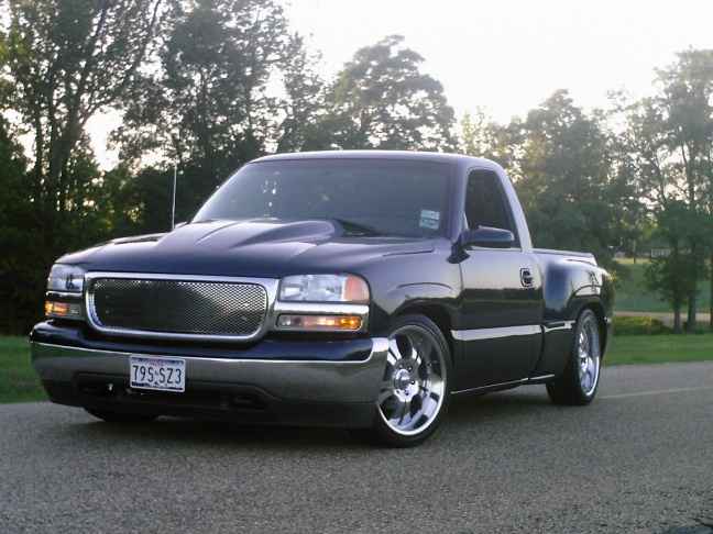 Goodmark cowl hood, speed grill, Tahoe painted door handles, billet antennae, Denali projectors, swapped for a fleetside bed, shaved tailgate and smooth rollpan