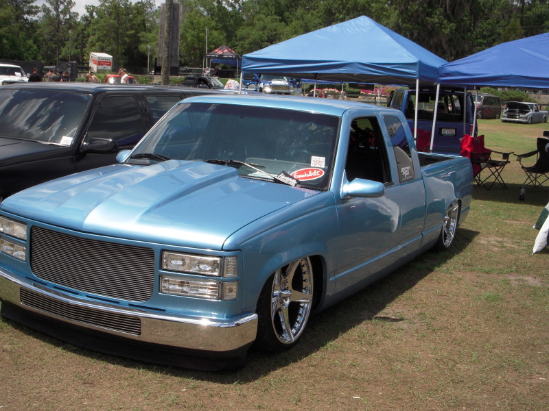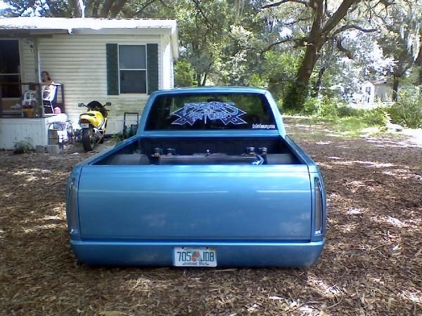 shaved doors ,3rd brake light,antenna,tail gate ,rollpan,tail lights, led clear caddys,cowl hood, chrome bumper w/billet insert, billet grill, ss mirrors painted light quazar blue metallic