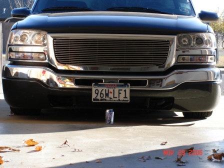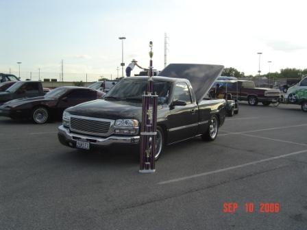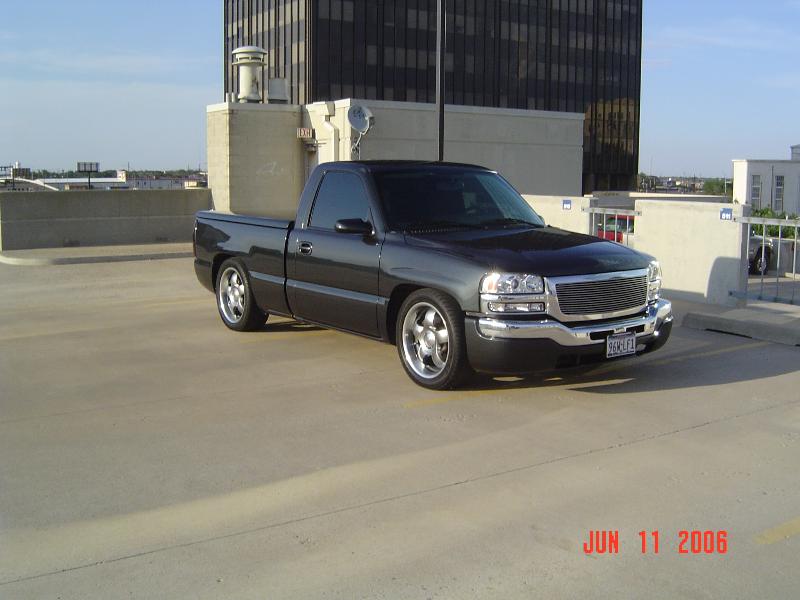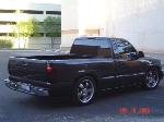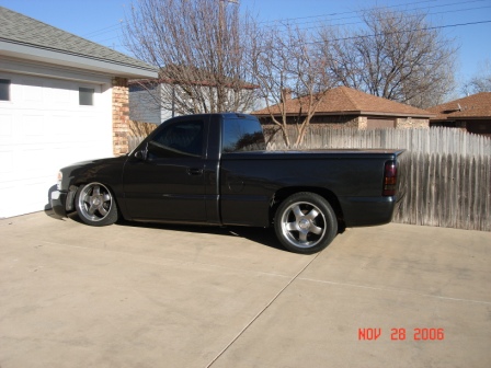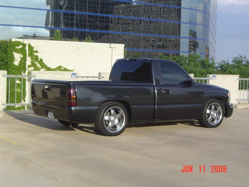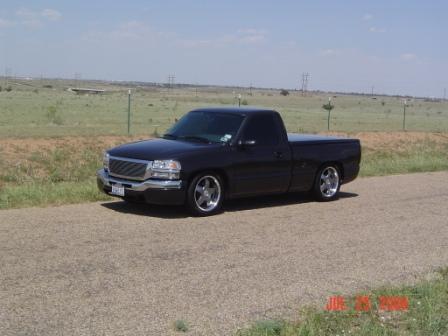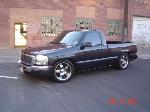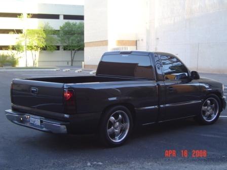 Dark Spiral Gray Metalic paint, Removed moldings and emblems, 8% tint on the windows, Smoked tail lights, Carriage Works billet grill, custom fiberglass front bumper, color match street scene mirrors, denali back door handles (NO key holes), color match snug lid, TYC denali style projector head lights, TYC clear parking light, Sir Michaels steal roll pan, shaved tail gate,60 inch.L.E.D. (Body work done by Larry at KUSTOM BIKES).