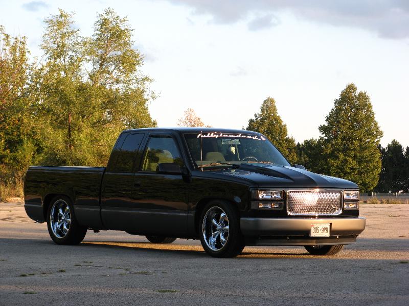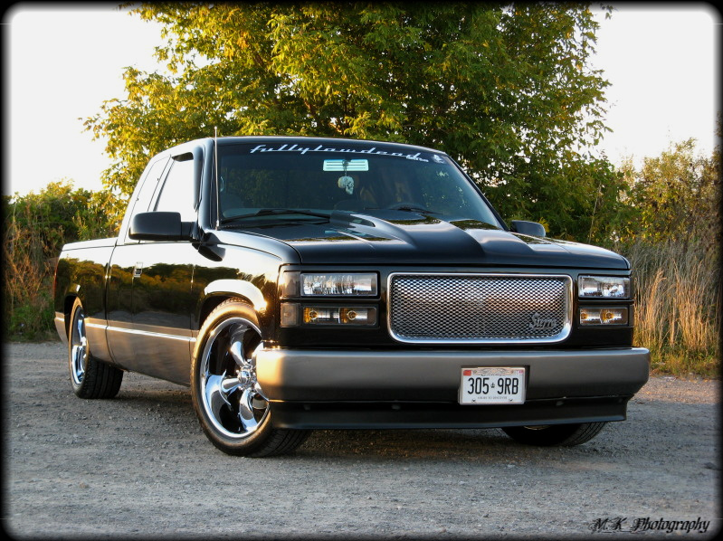 Stock Black with two tone 2010 GM Greystone Metallic on rockers,Street Scene speed grille insert with 1970's Sierra emblem,Painted and smoothed Denali handles,35% Tint, black/chrome parking lights,Black/chrome Headlights with 8000K HIDS,smoked OEM Style Corners,Red with Smoked Reverse Stock style LED Taillights, billet antenna, Smoothie Painted front bumper with custom Frenched plate, Goodmark Cowl hood, Ultamite Lining spray in bed liner. checkmate tonneau, Shaved Tailgate handle, Grant Kustoms molded roll pan