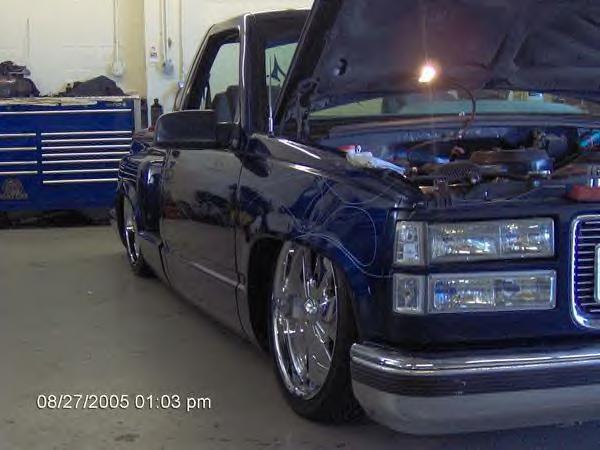 bagged all the way around...layes on 22...the front is cut out with 2 inch drop spindles and reinforced...in the rear i have a custom made triangulated four link with a tubular design...my air tank is floated in the air...i have all 1/2 inch MIC push in fittings...1/2 inch lines and 1/2 inch SMC valves....i have dual ply connitechs in the rear and 4 ply connitechs in the front....f--k slams