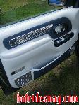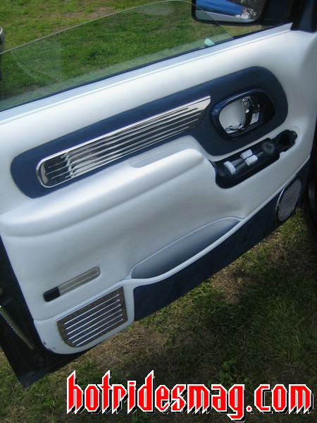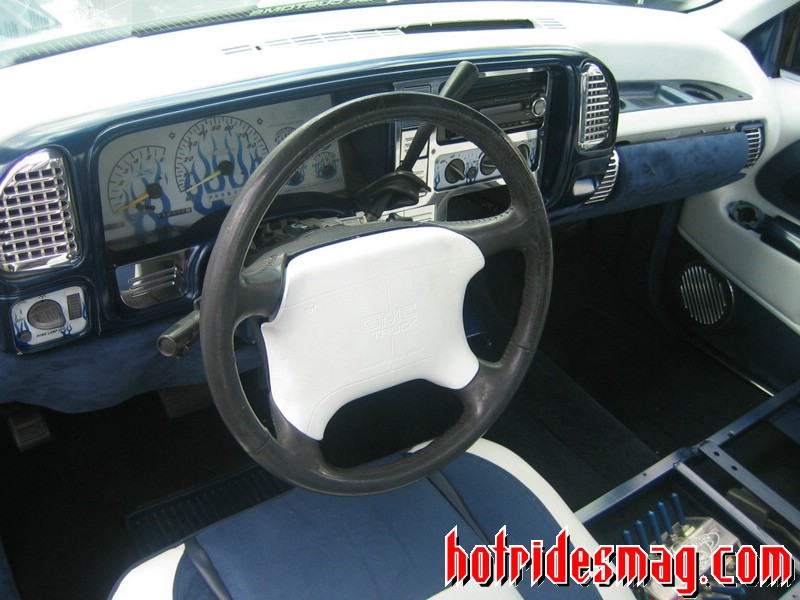 bucket seats that are wrapped in white leather and blue suede... dash is painted white pearl with white ice, other pieces painted blue to match the truck, flamed gagues, billet a/c vents, door seals, speaker covers, door vents, denali door handles, blue suede headliner