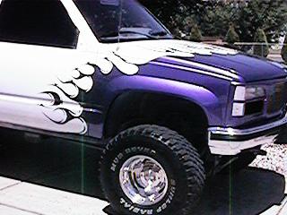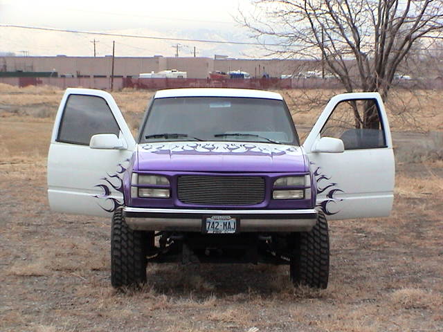 White with Purple flames, shaved everything. Frenched Ant. APC cat eye grill (before apc went pepboys on us)