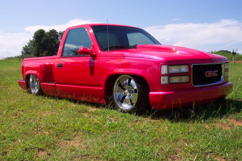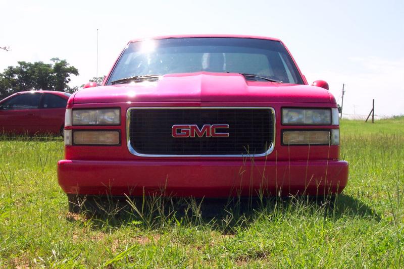 Viper red with blue pearl ghost flames, molded roll pan, all emblems and trim have been removed