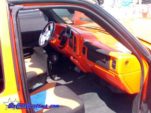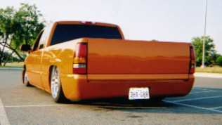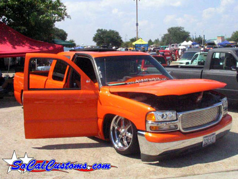 House of Kolor Tangelo pearl shaved door handles and taillights, third brake light, stake pocket holes, amd rain gutters, moldings, emblems, and gas door, shaved license plate brackets, beefy billet grill, Denali Headlights, molded in tailgate skin and roll-pan, shaved and relocated mirrors, billet tailights and mirrors, 40"x40" sliding ragtop, billet wipers