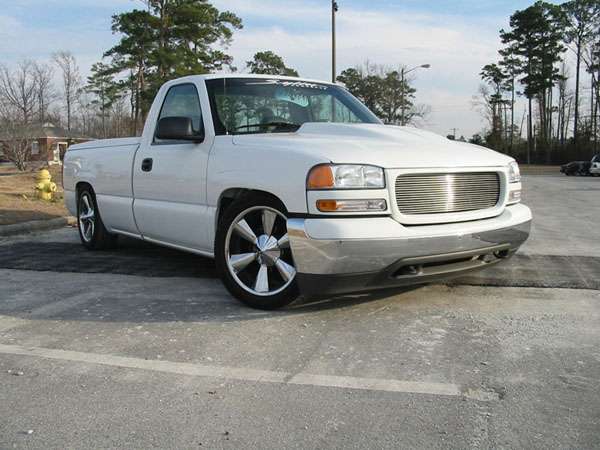 billet grille with painted perimeter, bed cover,molded roll pan, cowl hood, painted mirrors, shaved tailgate, and some stickers