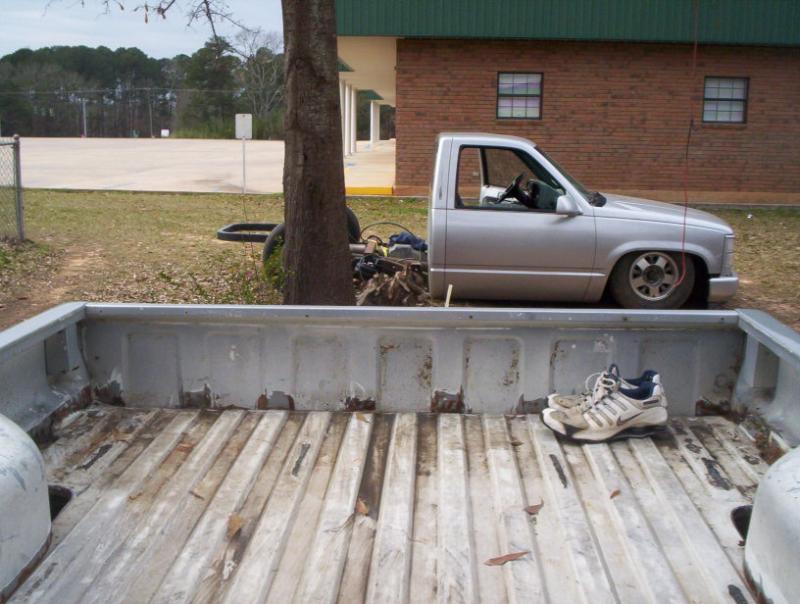 slam 7's in the front and 8's in the rear handbuilt frame from the firewall back stock floored with a AZ compressor Also I slid the cab back on the frame to get more clearance as not to tub the firewall as much