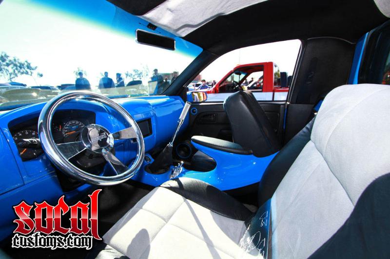 Dash is fully glassed and shaved and painted to match. All the other panels painted a matte black. Seats and headliner are black leather with a grey suede. Billet Bonspeed steering wheel. And a one off snap on torque wrench for the shifter. Has a full custom fiberglass and painted console that runs from the dash to the sub box. Holds the air zenith digital air gauges my switches and the shifter.