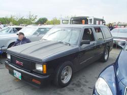 Goodmark steel cowl induction hood; shaved emblems, spare tire carrier, roof rack and antenna, smooth bumper, 2 tone paint