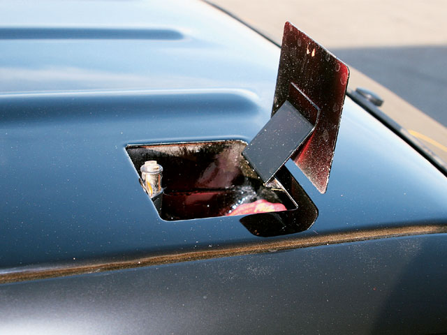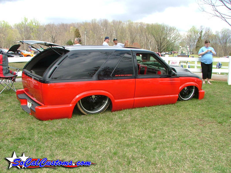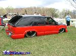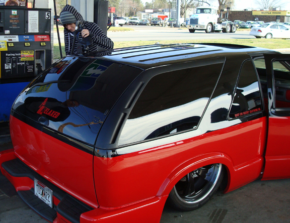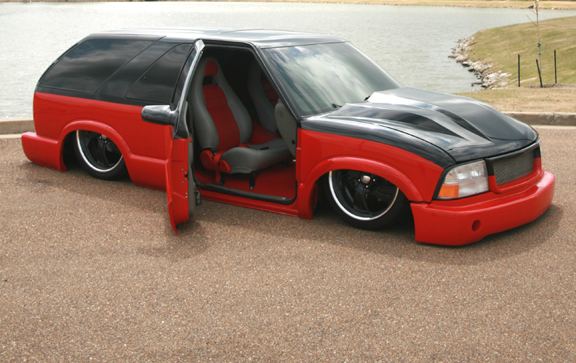 3" stock floor and 3" traditional = 6" body drop, doors sit about 1/4" from the ground; custom built hood; 98+ body style bumper with 2" added to the middle; raised hood and fenders 1.5" to clear the wheels; shaved: hood squirters, antenna, door handles, roof rack, 3rd brake light, gas door [relocated to the roof], tail lights, tag lights, rear wiper, passenger wiper; LEDs in rear bumper; painted Dupont Viper red and Kalapana black; suicide doors.
