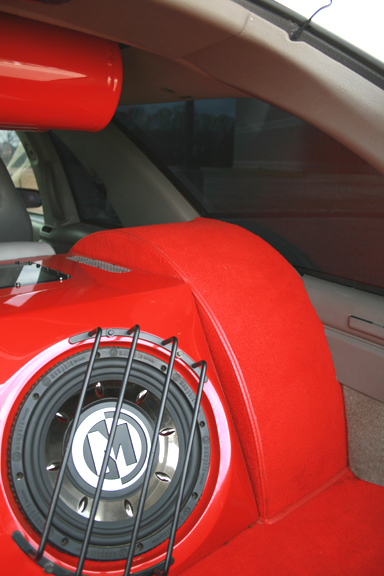 smoothed and painted misc. pieces; sheetmetal console holding air gauges and switches; pioneer headunit moved to headliner; memphis speakers and amps; mx3 seats reupholstered, along with rear jeep wrangler seat; 12" moniter molded into the dash.