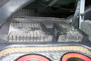 sony cdx 630 head unit, eclipse 4x6's 2ways in the dash powered by rockford (black and grind) 150a2, kicker 6.5 componants in the doors powered by a rockford (black and grind) 600a4 also a pair of kicker 6x9's in the rear running off the same amp, and to bring the bumps i'm running 4 cerwin vega 10's in a custom diamond plate encloser that are powered by a rockford (black and grind) 800a2, also i have a directed 7" monitor in the dash and 2 7" nesa monitors in the headrests all run off a ps2