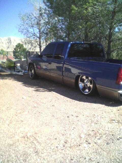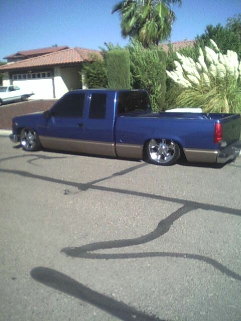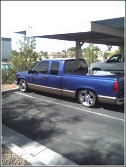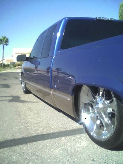 It has some HORRIBLE 2 tone paint, body dropped bed, shaved tail lights, shaved tailgate handle, and rollpan with star tail lights!