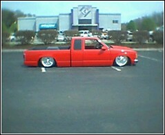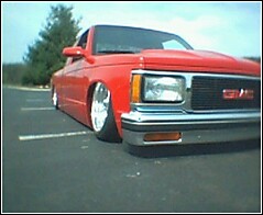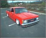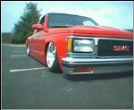 all the usual stuff shaved, Chevy Victory Red paint, updated GMC grill,goodmark cowl hood, 3 1/2 in. bodydrop on cab, 6 in. on the bed to keep stock floor in bed