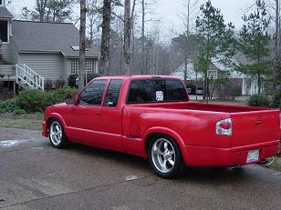 Plymoth Prowler red, lowered 3 in the front 5 in the rear, step shaver, roll pan, smoothie bumper, Rhino bed liner, 17 and 18" Boyd Smoothies, dual flowmaster exhaust.