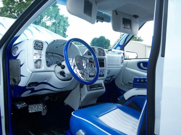INTERIOR PAINTED TO MATCH THE OUTSIDE OF THE TRUCK, BLUE FLAME GAUGES, BILLET KIT FROM F.B.I., BILLET GRAB HANDLE, SHIFTER, ENVOY DOOR HANDLES, BLUE CARPET WHITE HEADLINER