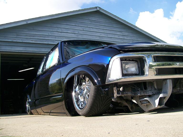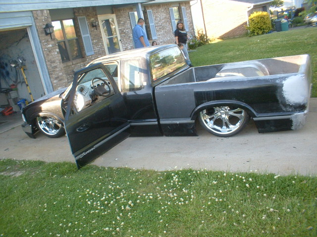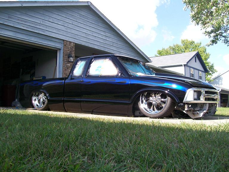 Sheet metal bed walls with the stock bed floor. Billet gas door frenched in the bed floor. Hand made tail light fillers from 16 gauge. Suicide doors, 10 inch LEDs.. Painted Viper black with Subaru blue ridge pearl flames. (pics soon)