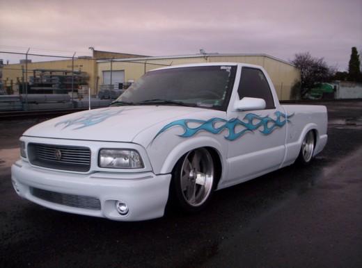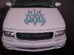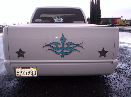 White w/ Light Blue Flames striped in black with stars shadowed throughout. 63 Stars throughout the suspension and tint and paint ect. 7" Star tail lights with LEDs