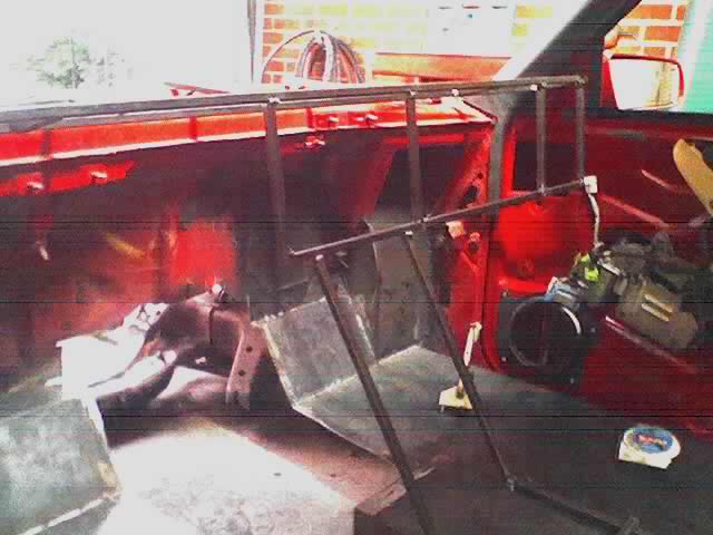 custom built frame out of 2x3 tubing, reverse cantilouver in rear and mustang two front suspension