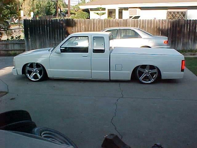Front: 2500 lbs bags, stock arms,no shocks. Rear: KP Components 6-link cantilever with bags,two 5 gallon tanks, 4 viair compressors,and 8 valves