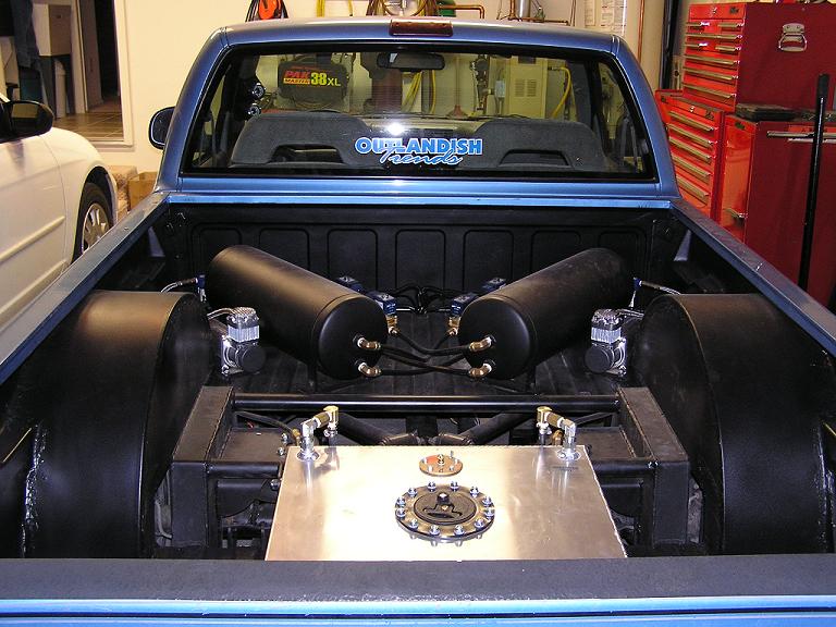 suicide doors triangulated 4link (36" bars), custom axle mounting bracket, all 1/2" bags, valves, ect...two viair 450's, two 8 gallon tanks, adjustable pressure switch, 10 switch switch box, contitech 2600's in the back and 2500's in the front