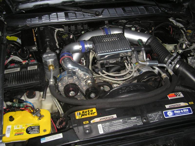 4.3L Vortec V6, Vortec Supercharger with K&N filter. Electronic Ignition by Crane Cams, Hypertech Power Programer, Electric cooling fan from "Flex-a-Lite", Custom Tranny with Ceramic Clutch, Custom drive shaft, "MagnaFlow" 4 inch custom stainless exhaust, Cross drilled rotors to make it stop.