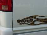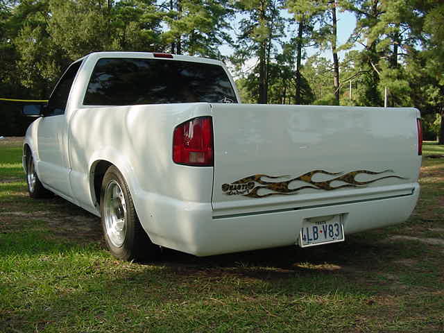 olymic white, fully shaved (except for 3rd brake light and tails) relocated antenna 5"x6" drop, gmc jimmy headlights, Tailgated has graphics on it by Max Maxwell from Chotic Customs, in Tomball,Tx....