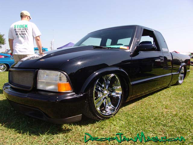 3 1/2" traditional body drop, everything shaved (except antenna), LEDs, sheet metal tubs in bed, custom 5 inch cowl hood, billet grille, aluminum fuel cell mounted in the bed