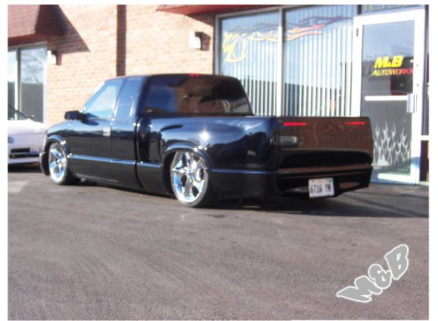 Got 8-1/2 SMCs, 1/2in line, RS72 Slam Bags front and rear, Custom painted 12gal tank with PROBLEM CHILD on it, 2-Viair 450s on custom tank mount, 175psi switch, Pete and Jakes 4 link, SD bridge, SD gas tank and carrier cearing X member, custom upper and lower shock mounts in rear, handmade Spade relay box, and a 10 switchbox.