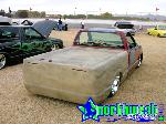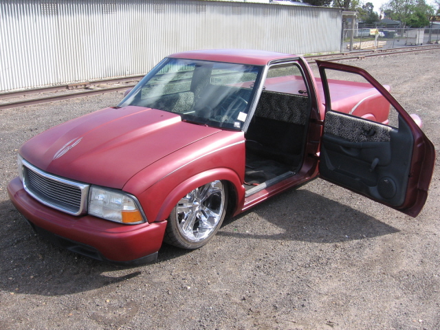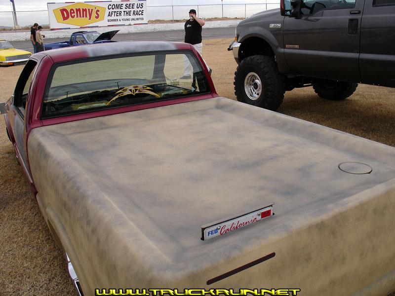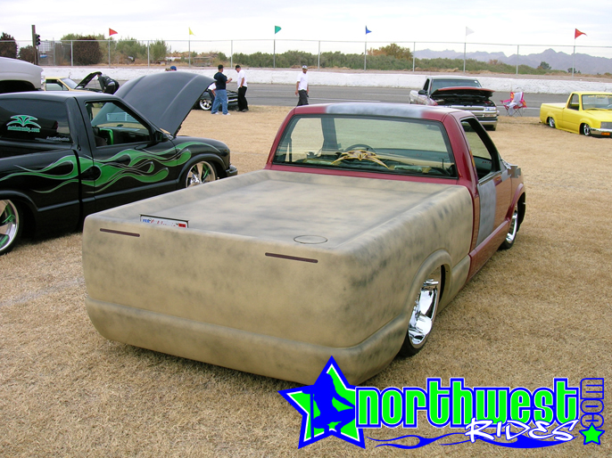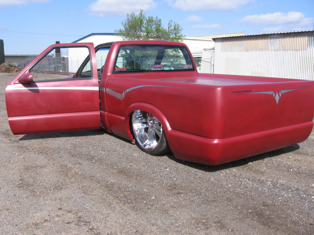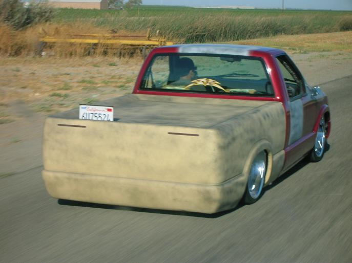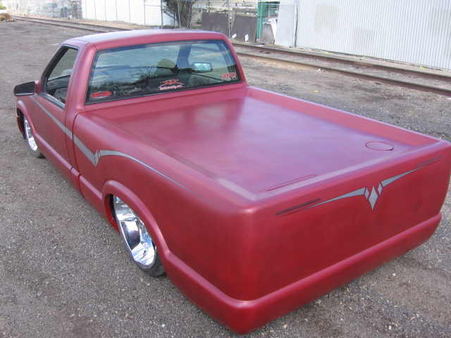 Shaved doors, antenna, third break light, break lights, gas door, custom bed floor which was raised then molded shut, molded skin with LED tail light, an AVS license plate retractor and stock gas door molded in bed floor, custom polished aluminum fuel cell,and suicide doors
