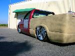 Front and rear air suspesion, 3/8 valves and line on Slam Specialty bags. New control arms and nothced out up front to lay a 20. The rear is set up on Settin' Trendz wishbone link and a huge notch to tuck a 22.