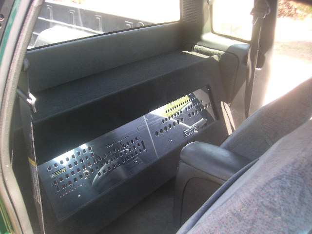 custom box showing 2 flush mounted amps. subs are hidden...downfire setup with two 12s