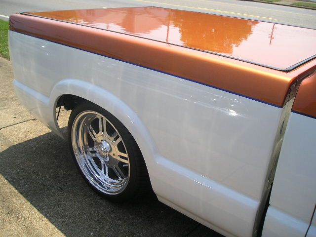 SOLD 6 INCHES TAKEN OUT OF EACH CORNER OF THE INSIDE OF BED TO MAKE BIGGER FENDERWELLS LOOK STOCK, SHAVED ANTENNA,DOOR HANDLES,THIRD BRAKE LIGHT,BED CORNERS, GAS DOOR, TAILIGHTS, TAILGATE HANDLE, WELDED ROLLPAN W/ LED TAILS, ENVOY BUMPER (WHITE, BLUE MICA, MANDARIAN COPPER METALIC)