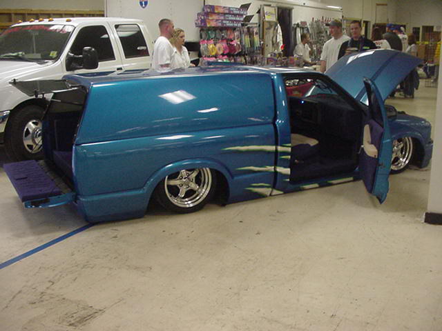 3.5" Body Drop (Done by Jody @ The Drop Shop), Shaved Doors, Molded Roll Pan, Samuri Tails, Shaved Gate, Cervins Fiberglass Cowl Hood, Lund Windowless Cap, Custom Paint Job