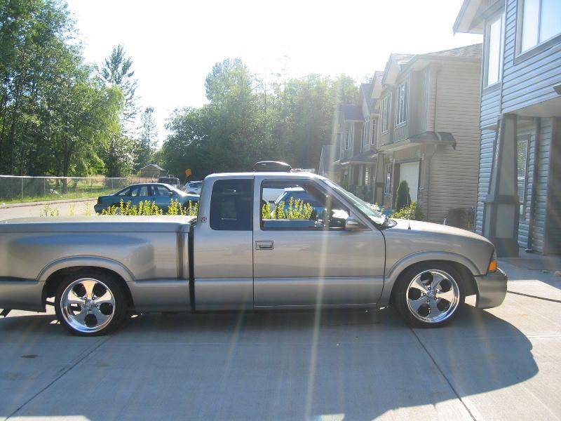 envoy bumper, with fog lights, no grille in bottom bumper yet... custom verticle grille, painted door handles, shaved tailgate, shaved tonneau cover handle, added 2 locks located at rear corners, sport mirrors painted to match truck, billet sport antenna