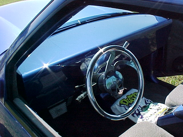 TWEED WITH GRAPHICS, AND A LOT OF PAINT, BILLET ACCESSORIES DIRECT "FURY" STEERING WHEEL IN FULL BILLET W/ SKULL CENTER CAP,AND SHIFTER. NO FUCKING A/C. FULL CUSTOM ALUMINUM DASH PAINTED TO MATCH. WHO NEEDS GAUGES?