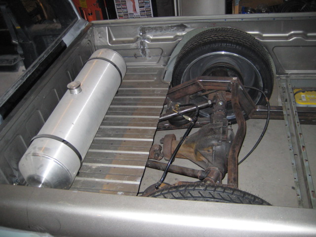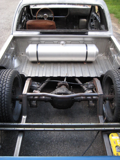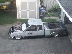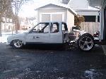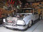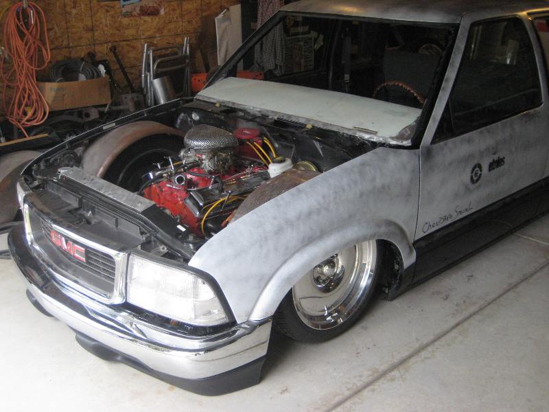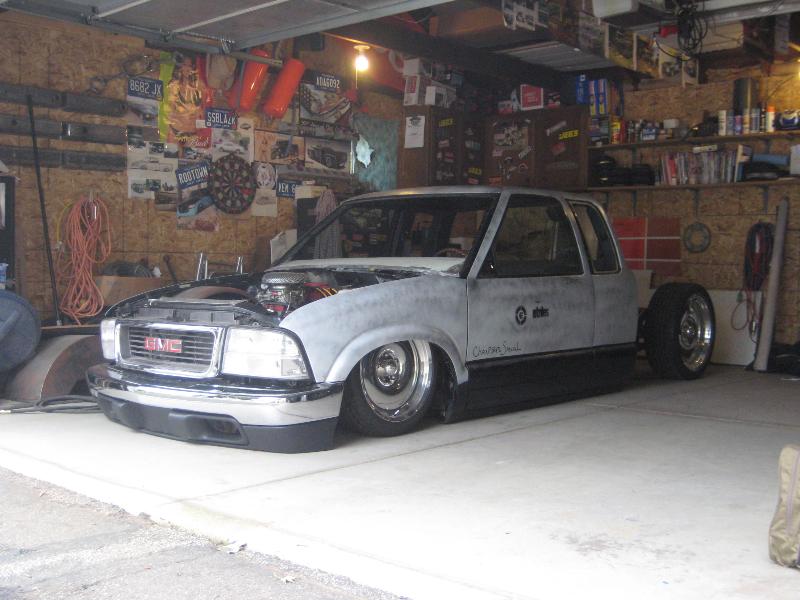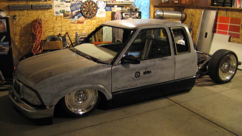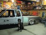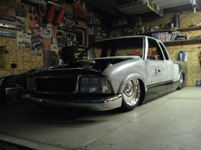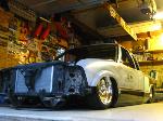 HotRod Flatz gunsmoke metallic paint soon, shaved everything except taillights, 3" traditional bodydrop, trailer fenders up front, Thorbecke Bros. tubs out back, roll pan w/centered plate box, stock hood, grille, and taillights, chrome smoothie bumper.