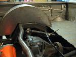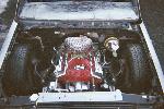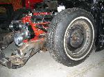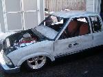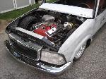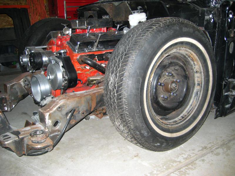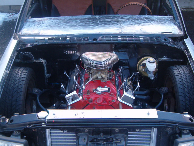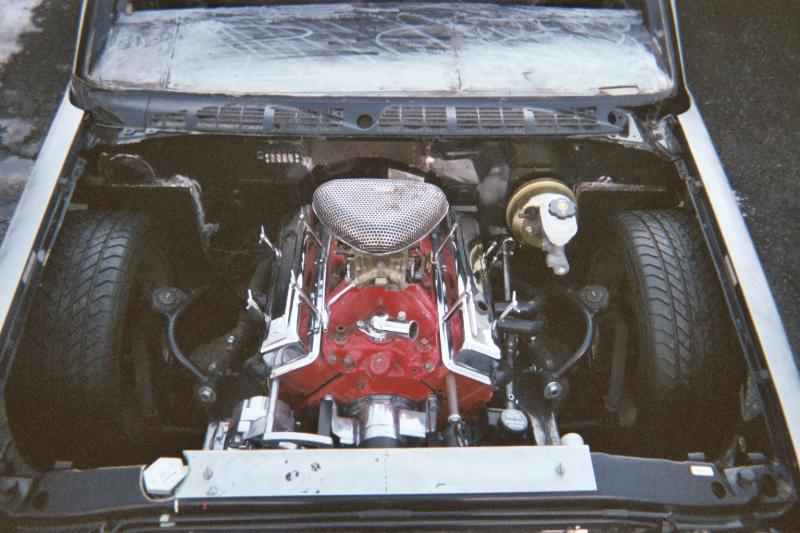 small block chevy under stock hood, Mallory HEI ignition, March serpentine pulleys, electric water pump, New vega box (manual), modified Hedman headers, Afco circle track solid motor mounts and mid plate, 700R4 trans, Hurst Quarter Stick, Howe Racing radiator, Twin electric fans, 7" booster, F-body master cylinder,14 gal MAS spun aluminum fuel tank, holley mech. fuel pump, Torker II intake for now with out the hood on, change to performer RPM (already have) when I run a hood, Barry Grant 650