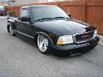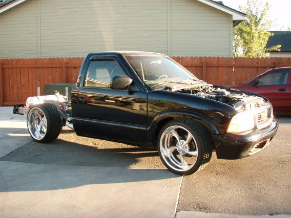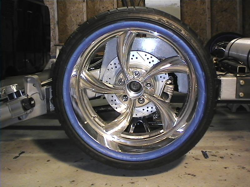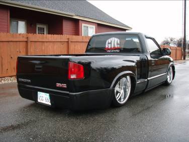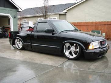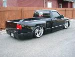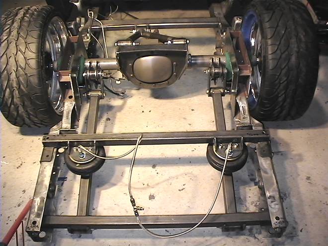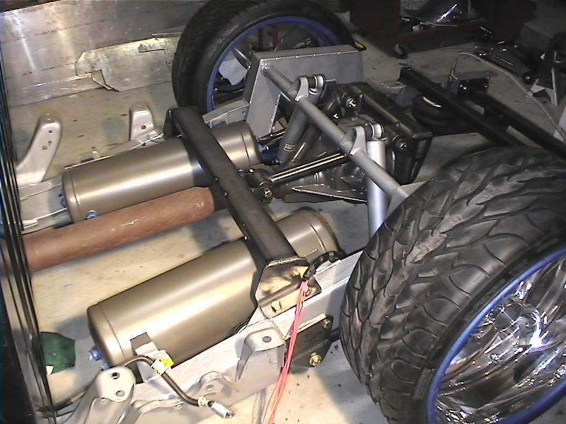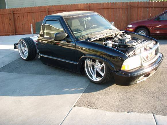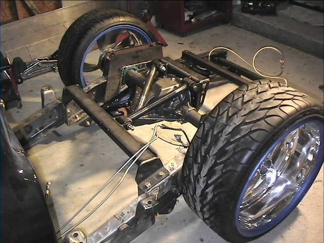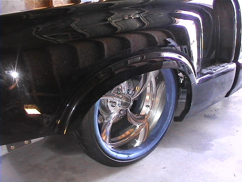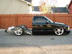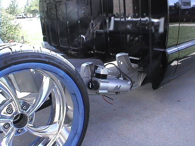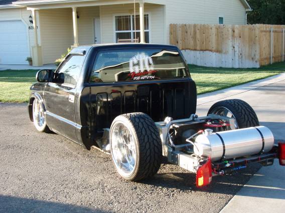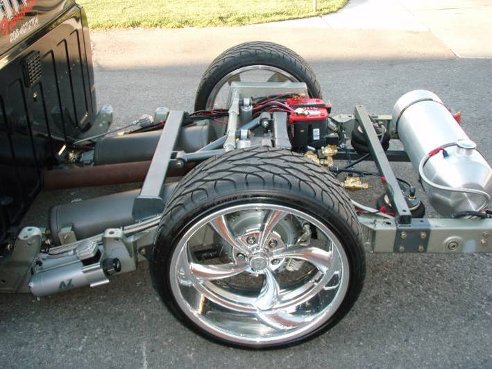 Baer rear disc's, Braided brake line's, 5-link Set-Up, Narrowed stock frame 5 1/2 inches, (8) 1/2 parker valves, (2) silver Air Zeniths,(2) 5 gallon SD tanks powdercoated titanium, Narrowed rearend powdercoated titanium, Shaved & smoothed frame rails,1/2 air line, 1/2 dump control valves, PTC fittings, Conti 2600's Back, Slams Up Front.