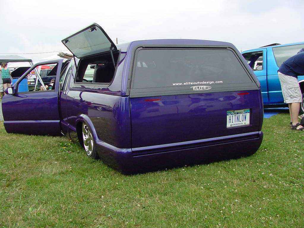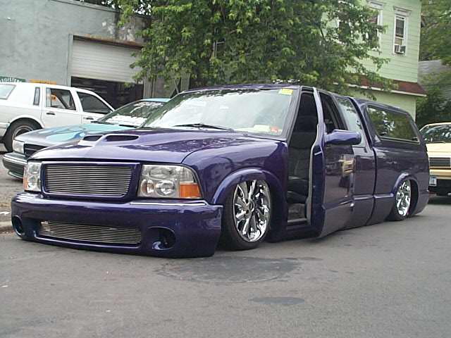 3 & 3/4 Inch Body Drop, 2000 gmc envoy front end, Shaved Firewall, Notched Firewall To Fit The 17'S, Factory Purple Paint, Sunroof, Billet Grille Insert, Leer Cap, Full Walk Through, Sir Michaels Smooth Roll Pan, Shave Tailgate With Frenched In License Plate Box, Shaved Tailights, Shaved Suicide Doors, Shaved Antenna, Flush Led Tailights , Ram Air Hood