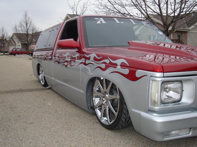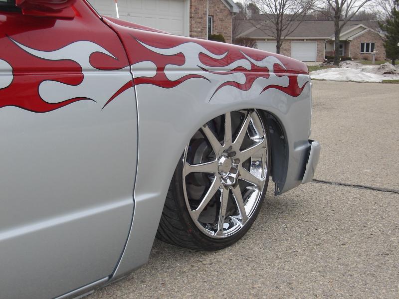 3" body drop, shaved door handles, locks,antenna, wipers, fuel door, tail gate and bumper bolts. custom fabed firewall. custom hood and mirrors. bed to cab walk through. metallic red and silver paint with tribal flame design.