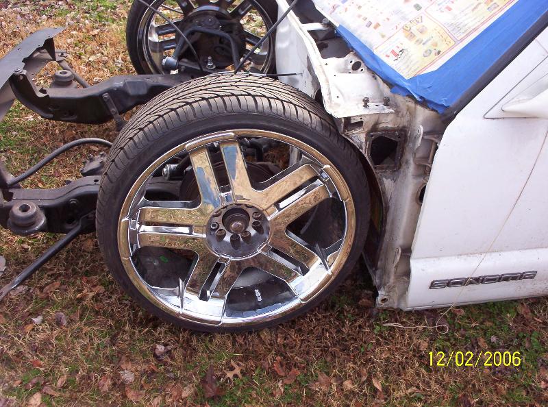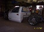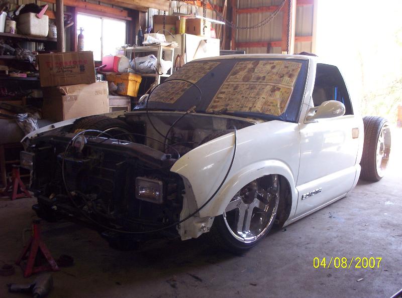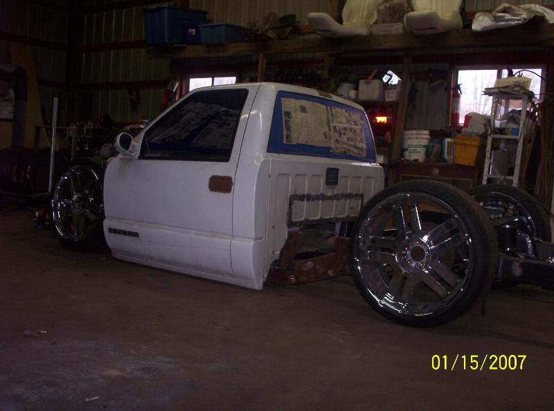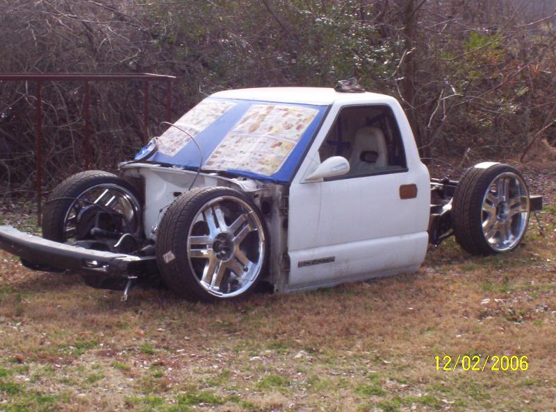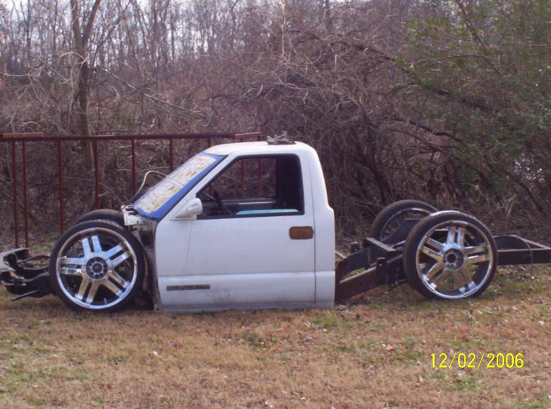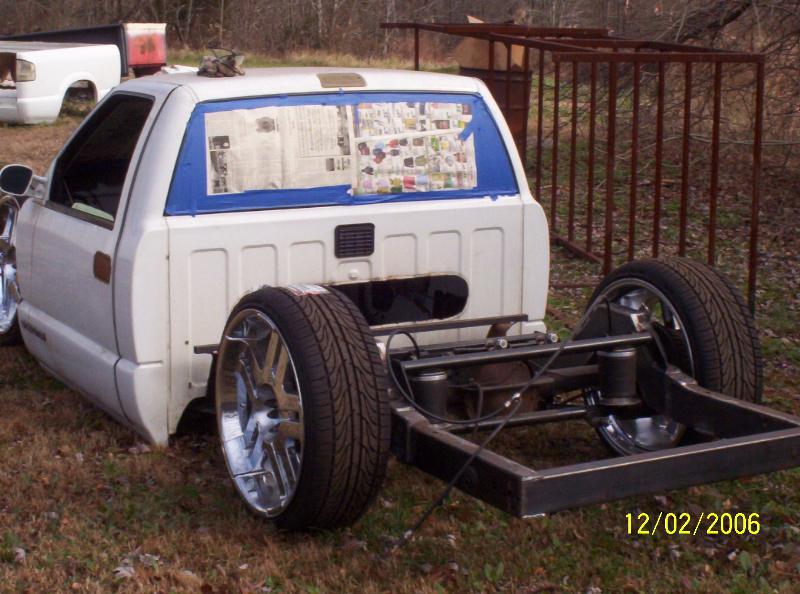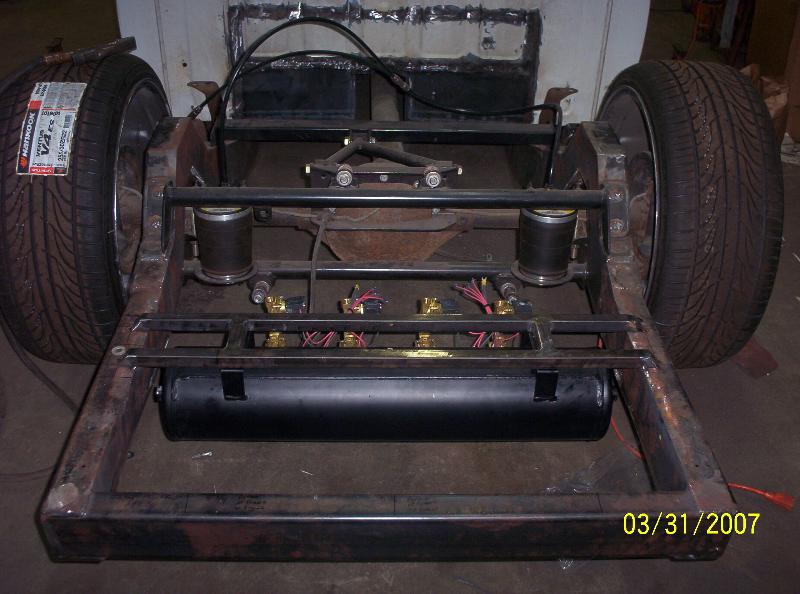 Front: Air ride technologys controlarms. 2600lbs. bags. Rear: Air ride technologys Road Greater kit.The frame is stock floored 3in. The rear has been welded in, smoothed, and the inside of frame plated. New Hooies fab shop transmisson crossmember. The frame work was done by Hooies Fab Shop.