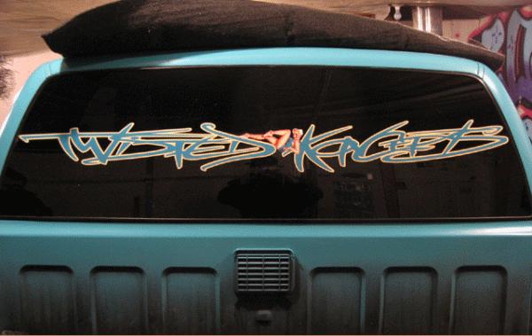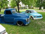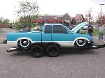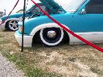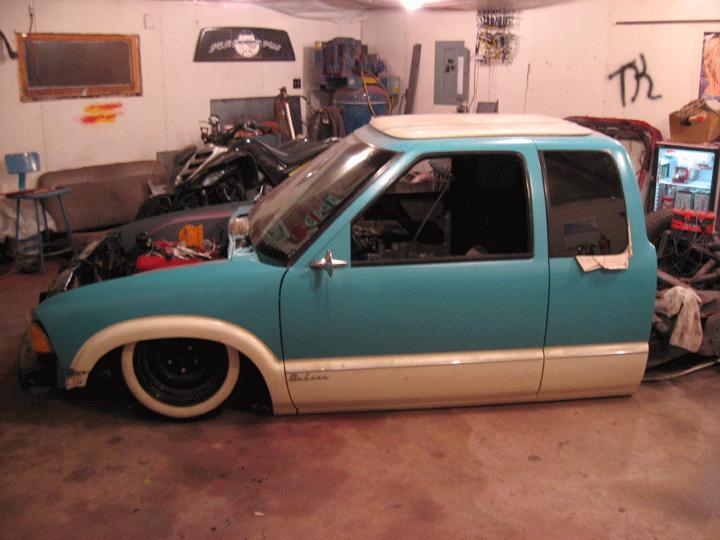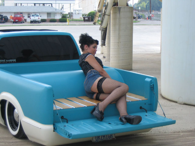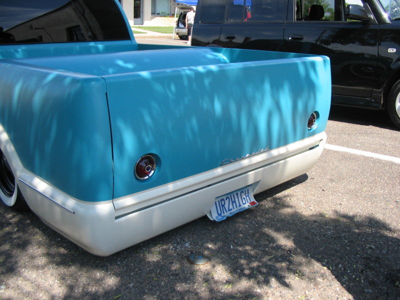 shaved and sealed in hot rod flatz primer/sealer, Uni-tub notch cover in bed, wooden bedfloor and smoothed out bedwalls done by crazytalkcustoms and old skool kustoms and creative illusions, gas filler in bedfloor, big hole in the roof to let the sunshine in and removable fiberglass roof section (tuck n' rolled), shaved everything, 57 mirrors, 1950 pontiac tailights, body dropped at creative illusions, custom grille made from a peterbilt grille